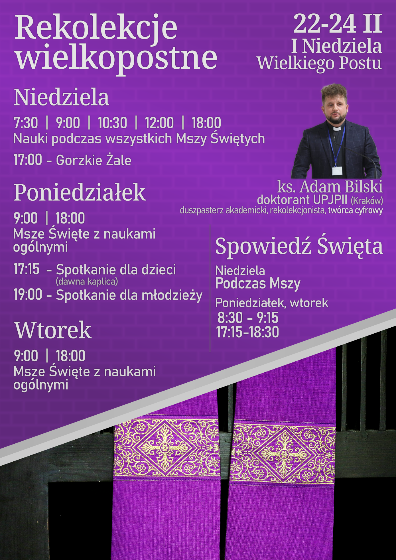 W poniedziałek, wtorek i środę 15 min. przed Mszą Świętą poranną.
